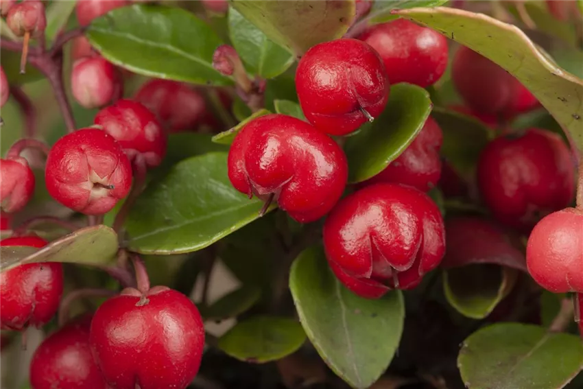Die Beeren der Scheinbeere bilden sich im Spätsommer aus, wenn aus den filigranen Kelchblüten kleine rote oder hellrosa Beeren werden. Eigentlich sind die Beeren aber wie zu erwarten gar keine Beeren. Es handelt sich um verdickte Kelchblätter, die eine dünnwandige Kapselfrucht mit einem giftigen Samen umhüllen. Scheinbeeren machen ihrem Namen also alle Ehre und sollte auf keinen Fall verzehrt werden. Schön anzusehen sind sie aber trotzdem! Und die immergrünen Blätter der Pflanze bringen die Beeren noch mehr zur Geltung.