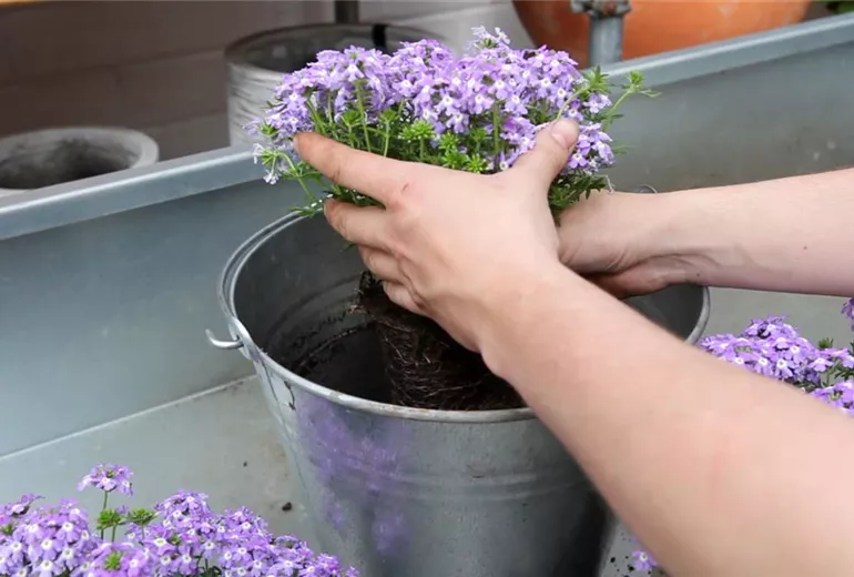 Um die Pflanze zu neuem Wurzelwachstum anzuregen, empfiehlt es sich, den Wurzelballen etwas aufzulockern; besonders wenn das Eisenkraut den alten Topf bereits stark durchwurzelt hat.