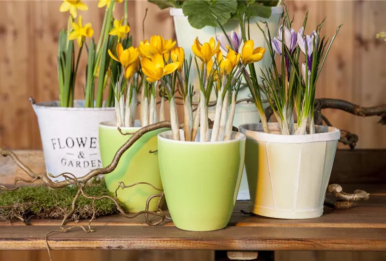 Sonnenschein und blauer Himmel, wenn man aus der Balkontür tritt? Keine rutschigen Stellen, kein Matsch? Ja, es wird Frühling auf dem Balkon! Kästen, Töpfe und Ampeln warten auf pflanzlichen Inhalt. Vor den Eisheiligen konzentriert man sich auf frostharte Pflanzen. Trotzdem deckt man die botanischen Lieblinge im Zweifelsfall lieber ab. Der Frühling auf dem Balkon beginnt mit einer geschickten Etagen-Konstruktion. Zuunterst im Pflanzgefäß warten die Zwiebeln von Traubenhyazinthen aufs Gedeihen, gern begleitet von gelben Narzissen. Im nächsten Stockwerk folgen Tulpen, und im letzten die zauberhaften Schneeglöckchen. Wer es bunt mag, ergänzt sie mit farbigen Krokussen.