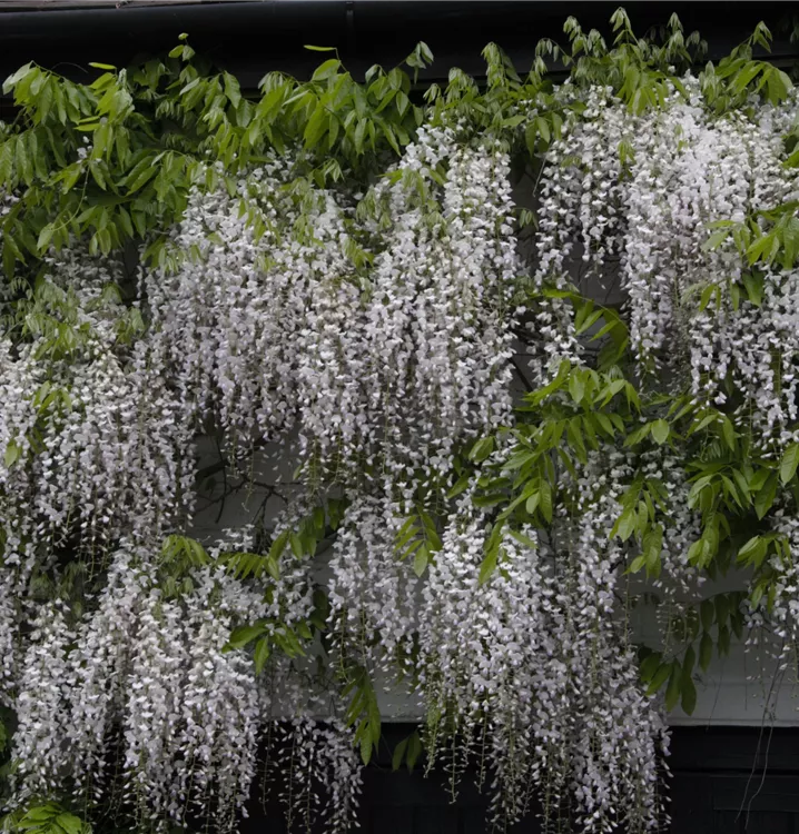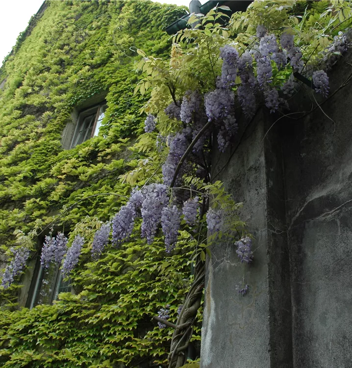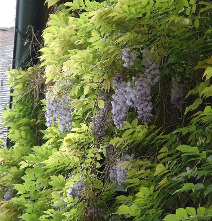Japanischer Blauregen ist ein rankend, verzweigt wachsende Kletterpflanze, welche eine Höhe von 6 - 8 m und eine Breite von 4 - 6 m erreichen kann.