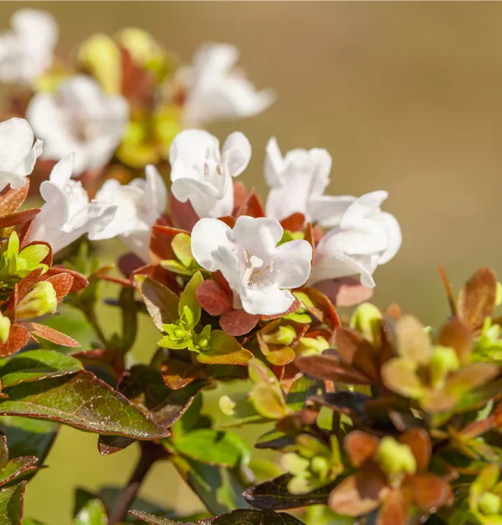 Abelia × prostata ist eine besonders kompakt und niedrig wachsende Form der beliebten Abelia-Gruppe. Sie bildet dichte, bogig überhängende Triebe und bleibt deutlich niedriger als die bekannten Sorten von Abelia × grandiflora. Von Juli bis Oktober erscheinen unzählige kleine, glockenförmige, weißlich-rosa Blüten, die zart duften und von Bienen und Schmetterlingen gern besucht werden. Das glänzend grüne Laub bekommt im Herbst einen rötlich-bronzenen Schimmer und sorgt so auch nach der Blütezeit für dekorative Wirkung.