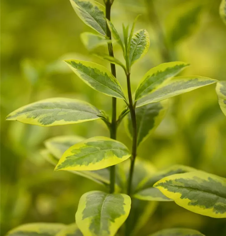 Eine Augenweide unter den Ölbaumgewächsen! Die hellen Blattspreiten des Ziergehölzes werden von goldgelben Mustern gesäumt und besitzen eine glänzende Oberfläche. Eine Komposition, die malerische Lichtspiele ermöglicht! Der Goldliguster besticht darüber hinaus durch seinen dichten Wuchs und seine aufrecht stehenden Äste. Ob als Sichtschutz oder einfach als farbenfroher Blickfang – Der Goldliguster 'Aureum' weiß mit seinem immergrünen Laub zu verzaubern!