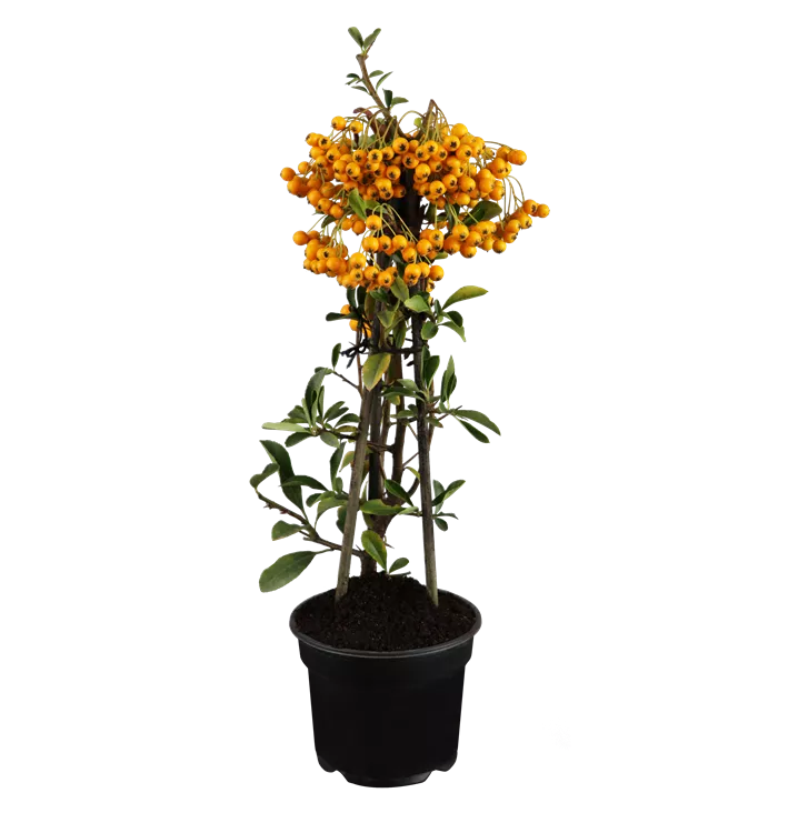 Besonders dekorativ sind die leuchtend orangegelben, runden Früchte von Pyracantha. Diese erscheinen ab September. Haften sehr lange.