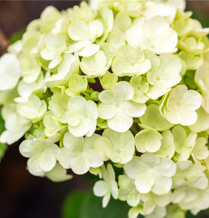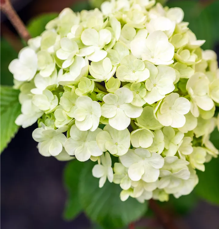 Die weißen, gefüllten, ballförmigen Blüten des Japanischen Schneeball First Editions® 'Opening Day' erscheinen in Trugdolden im Mai. Diese sind stark duftend.