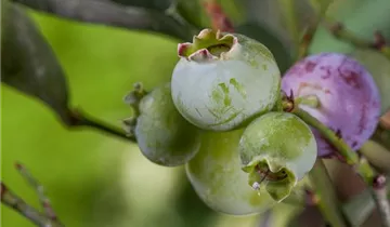 Die Heidelbeere 'Bluegold' (Vaccinium corymbosum) bildet blaue Beeren. Diese sind süß-säuerlich im Geschmack. Für eine ertragreiche Ernte ab Mitte Juli schaffen humoser, sandiger, feuchter bis nasser Boden und ein sonniger bis halbschattiger Standort optimale Bedingungen. Auch ihre hellrosafarbenen Blüten sind eine schöne Erscheinung.