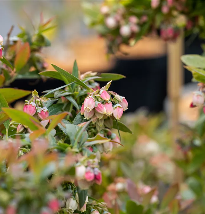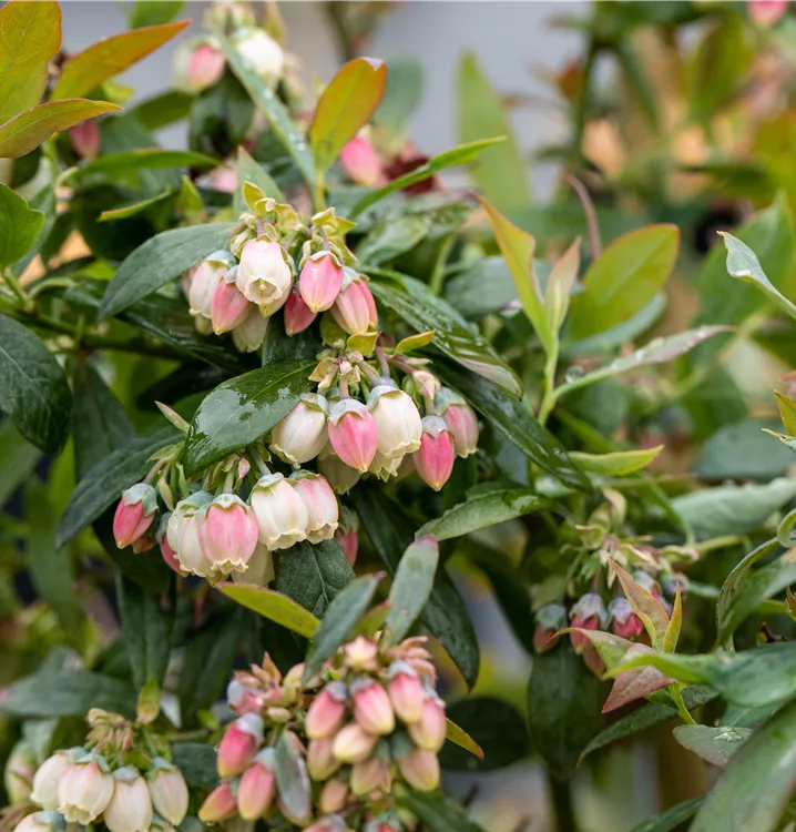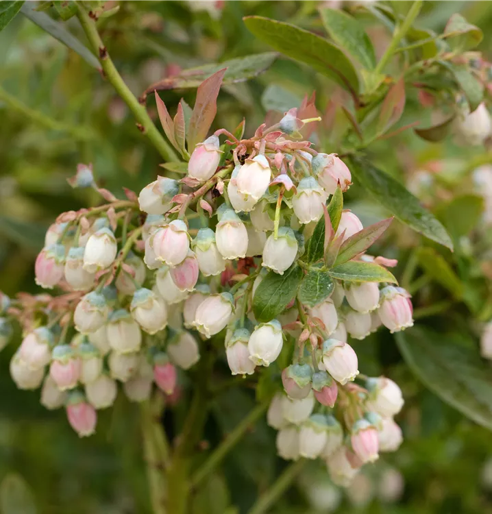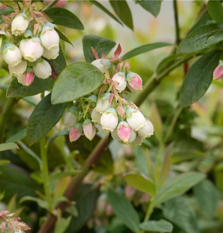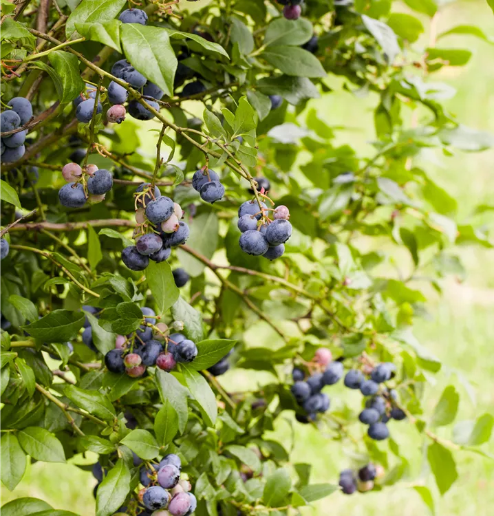 Die Heidelbeere 'Sunshine Blue' (Vaccinium corymbosum) bildet blaue, mittelgroße, große Beeren. Diese sind süß im Geschmack. Für eine ertragreiche Ernte ab Juli schaffen saurer Boden und ein sonniger bis halbschattiger Standort optimale Bedingungen. Ihre hellrosafarbenen Blüten sind eine schöne Erscheinung. Die Heidelbeere 'Sunshine Blue' wird mit ihrem buschigen und breiten Wuchs etwa 2 m hoch und 2 m breit, dadurch kann sie hervorragend in Töpfen auf Balkon oder Terrasse angebaut werden.