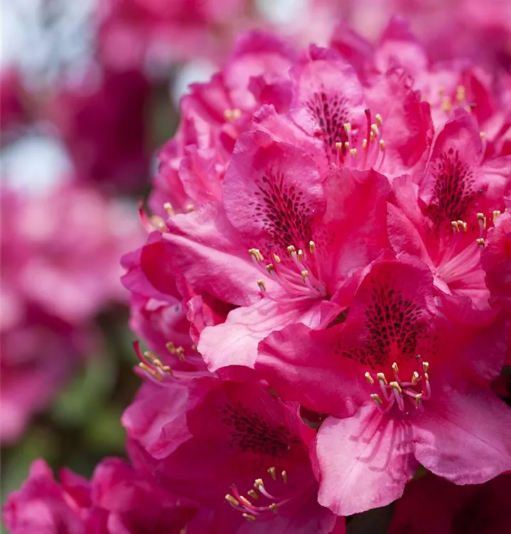 Rhododendron 'Erato'(s) bildet von Ende Mai bis Mitte Juni zahlreiche trichterförmige, in Dolden angeordnete, dunkelrote Blüten mit dunkelroter Zeichnung.