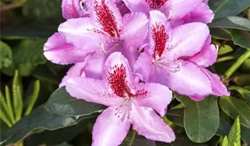 Der Rhododendron Hybride 'Furnivall's Daughter' (Rhododendron) zeichnet sich durch besonders große, immergrüne Blätter aus. Die bereits Anfang Mai erscheinenden Blüten sind hellrosa mit einer auffallend dunklen Zeichnung.