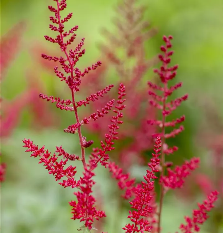 Astilbe x arendsii 'Astary Red'® bildet in Rispen angeordnete, rote Blüten ab Juli.