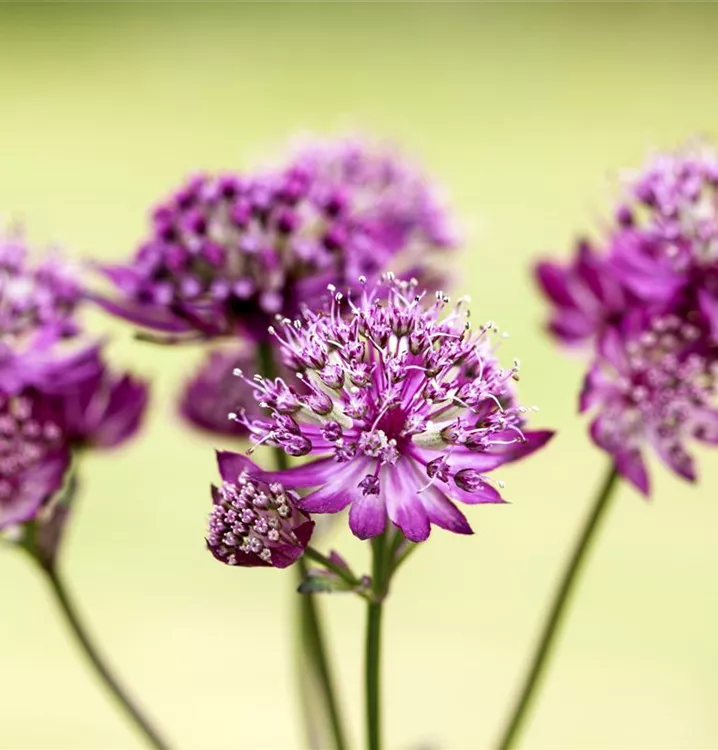 Astrantia major 'Abbey Road'® bildet sternförmige, in Dolden angeordnete, purpurrote Blüten ab Juni. Bei richtiger Pflege Nachblüte im September.