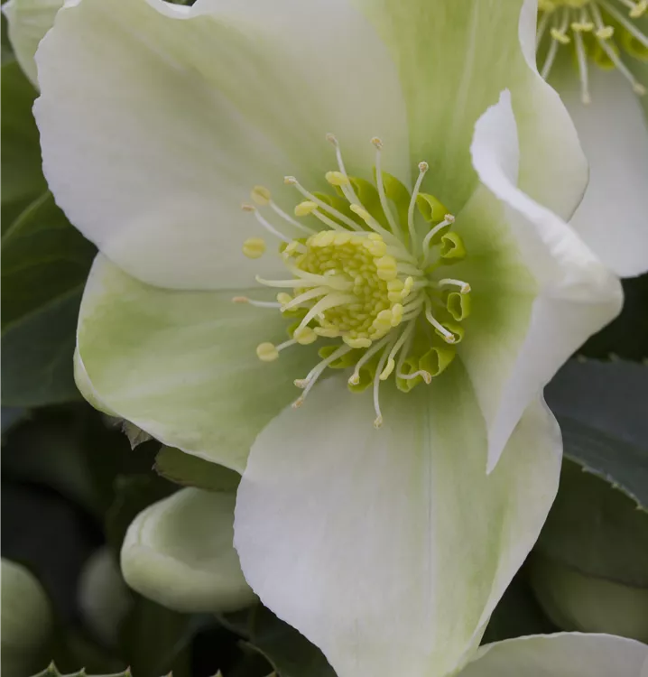 Helleborus niger bildet schalenförmige, weiße Blüten ab Dezember.