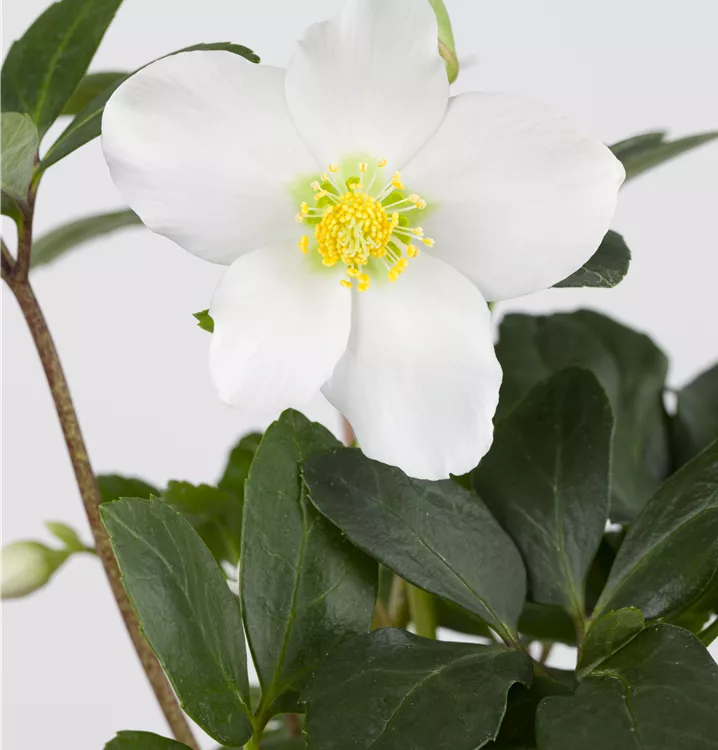 Die Christrose (Helleborus niger) ist eine wintergrüne Staude, die von Dezember bis März weiße, schalenförmige Blüten bildet.