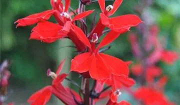Die Leuchtende Lobelie (Lobelia cardinalis) ist eine Staude, die von Juli bis September rote, in Rispen angeordnete Blüten bildet.