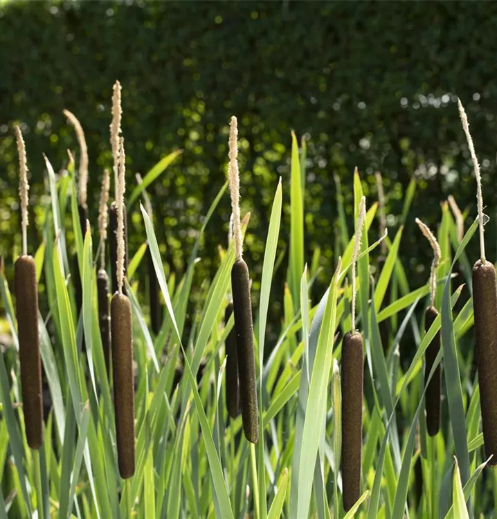 Der Schmalblättrige Rohrkolben (Typha angustifolia) ist mit seinen dunkelgrünen Blättern eine ausgesprochen dekorative Wasserpflanze, die für solche Einsatzbereiche wie Teichrand, Bachlauf, Teich, Landschaft und Sichtschutz besonders gut geeignet ist. Die Blüten erscheinen, je nach Sorte, in vielen Farben von Juli bis August. Er bevorzugt humosen, nährstoffreichen Boden in sonniger Lage. Der Schmalblättrige Rohrkolben ist gut frostverträglich. Die aufrechte, ausläuferbildende Staude erreicht gewöhnlich eine Höhe von ca. 2 m.